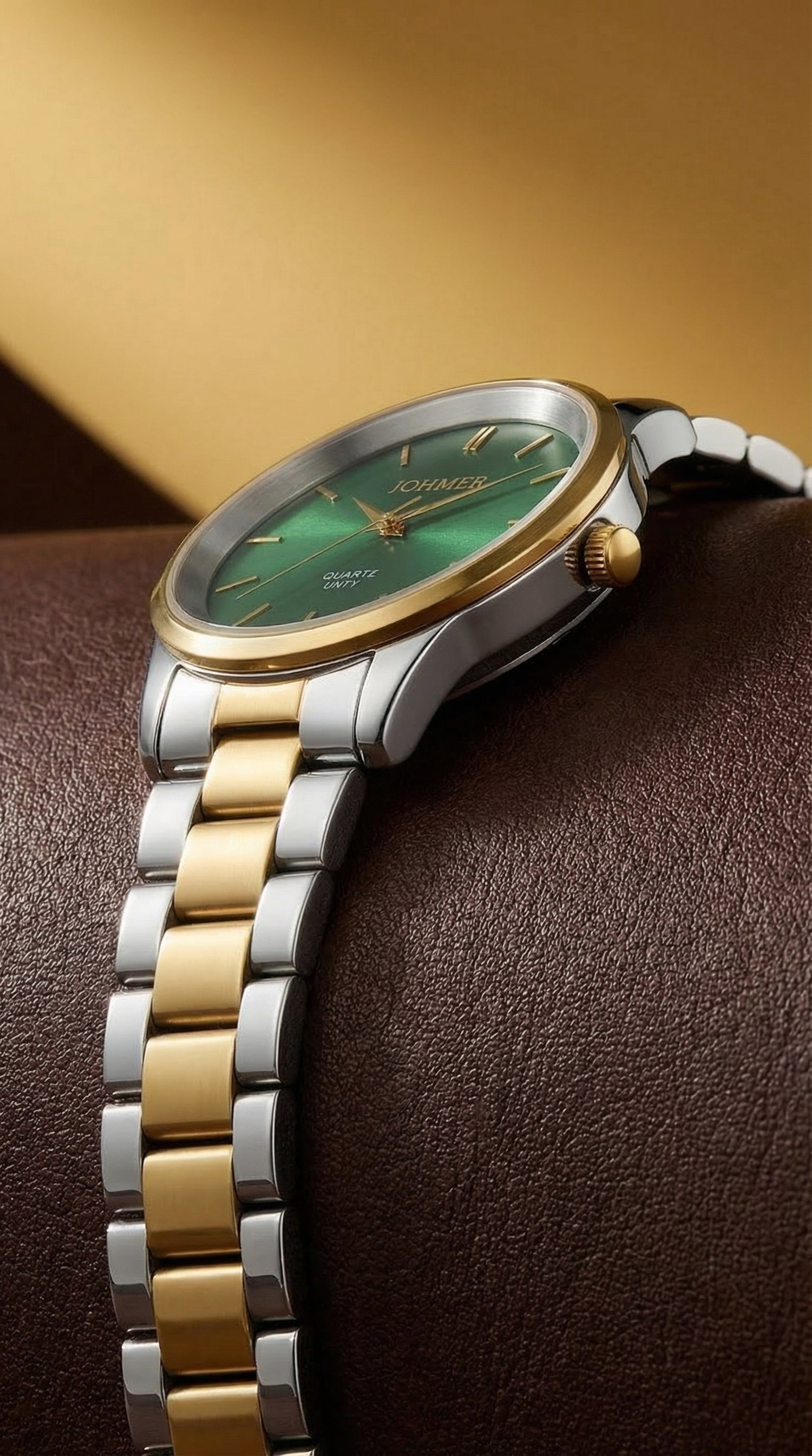 A sleek green dial with gold accents and a two-tone strap elegance and precision in one.