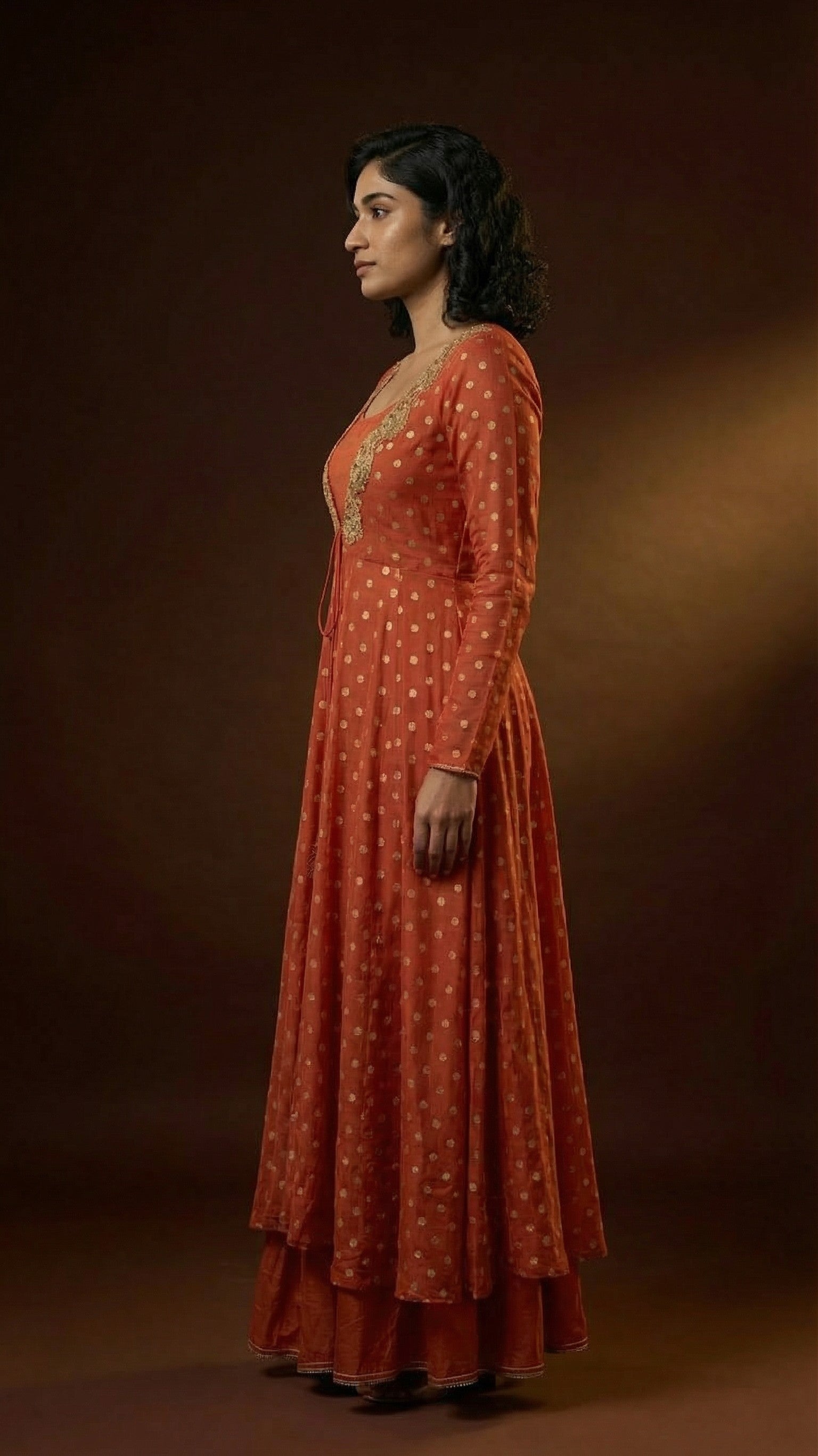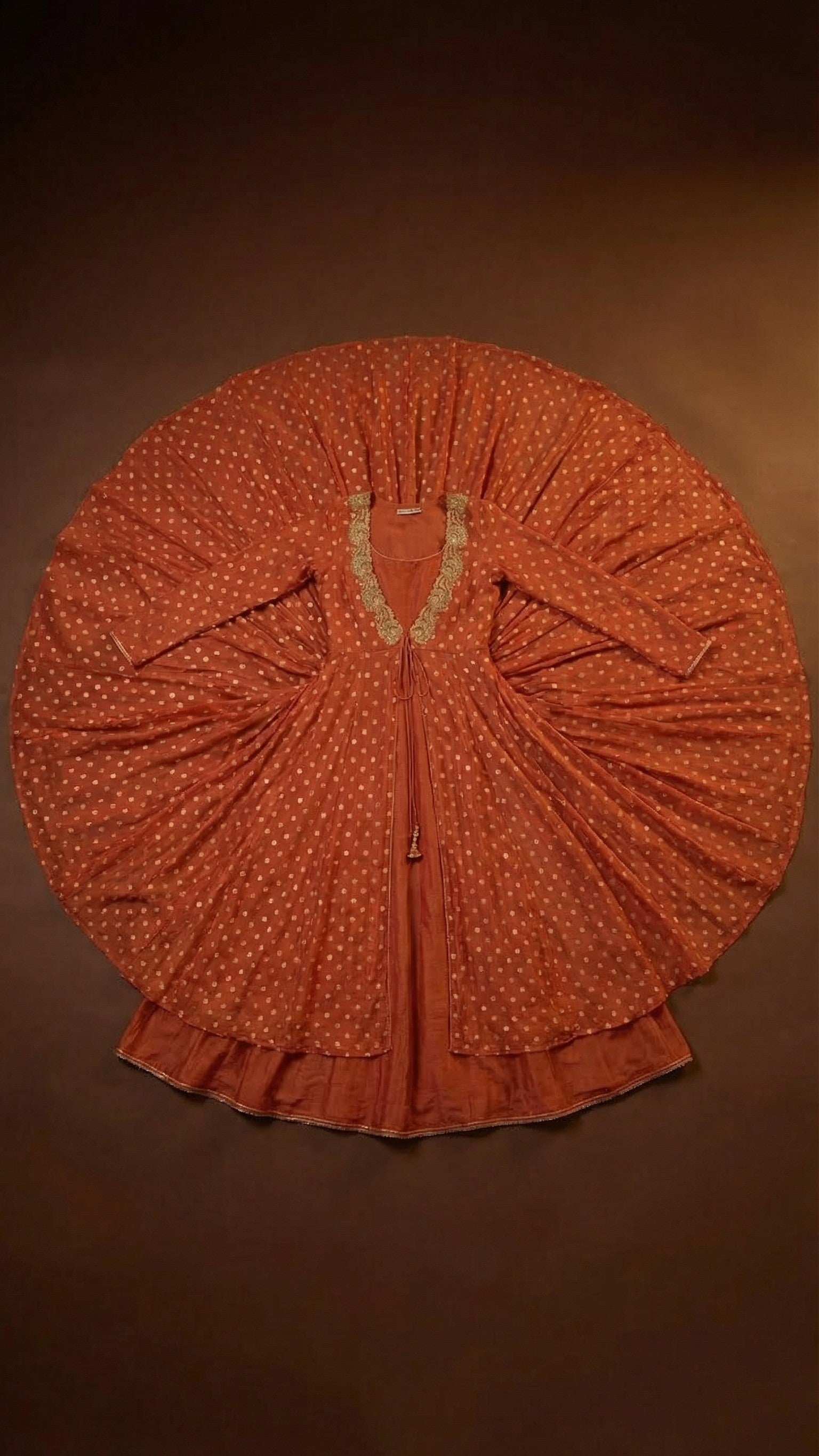 Make a regal statement with this exquisite rust-orange layered ensemble featuring delicate gold foil dot prints throughout. The flowing Anarkali-style jacket showcases intricate gold embroidered neckline detailing and gracefully drapes over a coordinating inner kurta and palazzo pants. This luxurious three-piece set combines traditional craftsmanship with contemporary silhouettes, perfect for weddings, festive celebrations, or any occasion where you want to radiate elegance and sophistication.